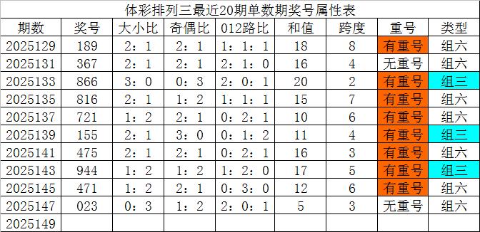 体彩罗列三最近20期单数期奖号隔离为:189、367、866、816、721、155、475、944、471、023,各期奖号详备属性下表: