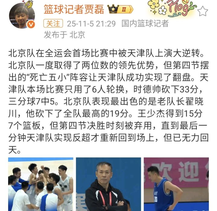 著名体育博主三土带刺也发博示意:“这场输球后,北京队出线面貌有点不利,十分是争第二悬了。”