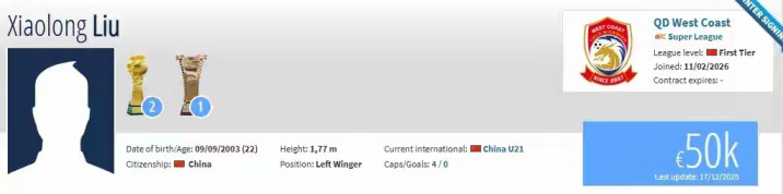 与彭欣力不同,22岁的刘小龙代表着球队的异日。这位年青前卫在2025赛季租出加盟青岛西海岸时刻,共出场15次,孝顺了2次助攻。这次郑重转会,刘小龙不异所以目田身加盟,德回身价为5万欧元。
