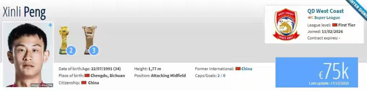 现年34岁的彭欣力司职中场,是别称训戒丰富的宿将。他在2025赛季上半程代表山东泰山出场13次,孝顺2次助攻;下半程租出至长春亚泰时刻出场5次,不异送出2次助攻。这次加盟青岛西海岸,彭欣力将以目田身转会,他的德回身价现在为7.5万欧元。