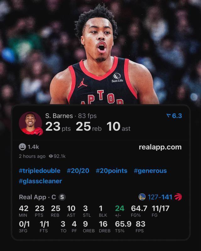 投入第四节,巴恩斯冉冉领受了比赛。他在攻防两头展现出极强的总揽力,尤其是在篮板球的拼抢上占据足够上风,屡次为球队争取到二次蹙迫契机。比赛终末手艺,在第四节还剩24秒时,巴恩斯抢下要津前场篮板并完成补篮,将比分武断扳平。巴恩斯整场比赛中砍下23分25篮板10次助攻3次抢断,这是猛龙队史首个“20+20”的三双数据。此外,巴恩斯还追平了猛龙队史篮板记录。库里在赛后也对巴恩斯今天的证实赞赏有加:“巴恩斯在场上很有存在感,况且他是一位出色的组织者,即使他的立场有点非传统,但他能期骗错位上风。”