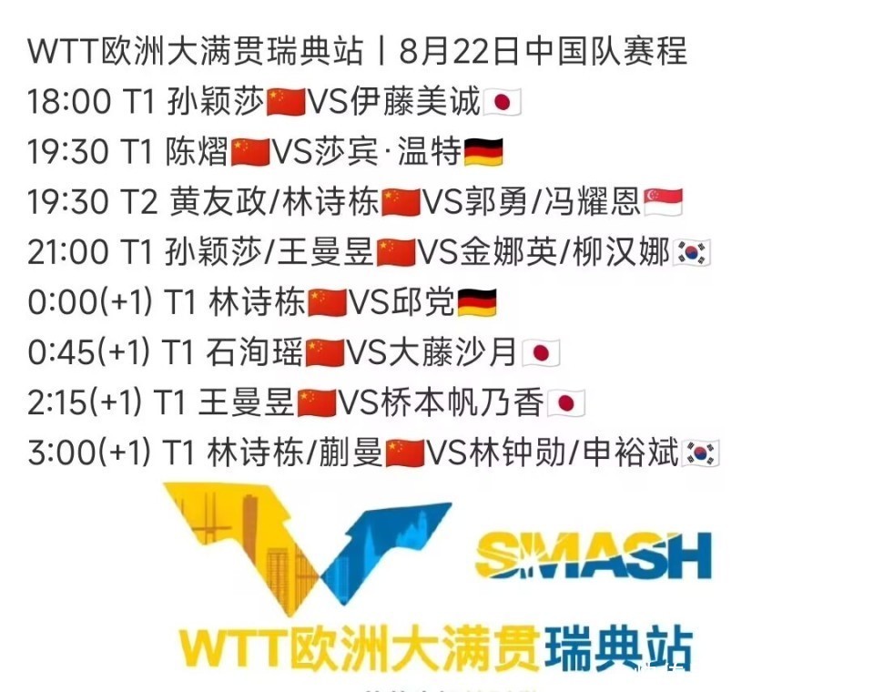 8月22日21:00,WTT欧洲大满贯瑞典站女双:国乒组合孙颖莎/王曼昱VS韩国组合金娜英/柳汉娜。